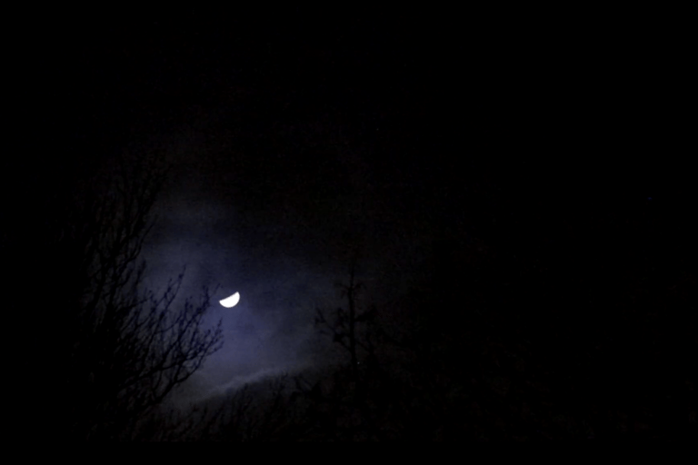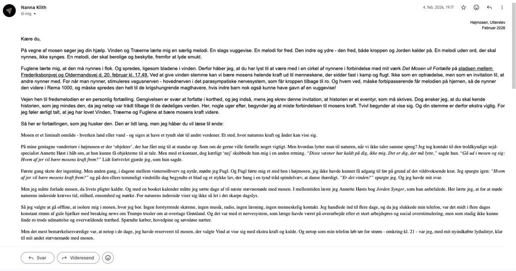 (...) Det var intenst at gå ind i højmosen i den bidende kolde januarvind, uden grusbelagte stier og lygtepæle, uden mobiltelefon og med alle lyde forstærket gennem optageren. Den frosne jord knirkede under mig og Vind ruskede i træerne og skubbede mig i ryggen - hen mod det sted Fugl, havde vist mig.