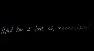 (...) I badet, næste morgen, så jeg at mine tabte hår på fliserne dannede et billede. En menneskeskikkelse med en vandrestav, og et dyrelignende væsen med to store runde øjne. Den ene cirkel begyndte at åbne sig og jeg fik tanken: Var mit spørgsmål forkert? Måske skulle jeg have vist mere ydmyghed og i stedet have spurgt: “Hvad kan I gøre for mig?” eller “Hvad kan I lære os, menneskene…?” Men jeg måtte vente med at spørge til mørkets frembrud.