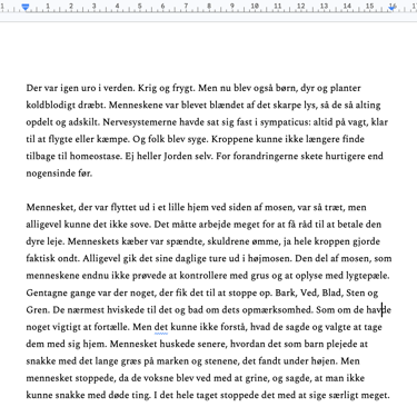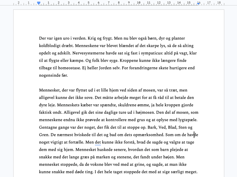 (...) Det var ikke mosen, der skræmte mest. Det var lydene udenfor, fragmenteret af de insisterende vindstød; biler, der accelererede, en hund der gøede, råb, nærmest skrig, fra menneskene. Jeg talte op til de høje, spinkle træer; hvad er det I gerne vil sige? Straks efter lød et højt skud, som gav et sæt i min krop, da lyden var ekstrem insisterende i mine høretelefoner, men jeg fortsatte med at tale op til træerne; I virker så skrøbelige? Er I bange? Jeg kunne høre deres stammer knirke. Nærmest som en slags klagesang. Eller varselsskrig.