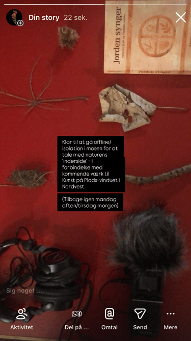 (...) Jeg tog høretelefonerne på og skruede optageren på en sammenfoldet tripod. Med den langhårede, pelsede vindhætte, lignede det nærmest en vandrestav med et kraftdyr på toppen. Jeg stillede mig foran broen, udenfor min lejlighed, der fører ind til højmosen. Tog en dyb indånding og gik med raske skridt over broen og ind i mørket.