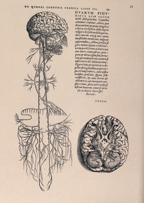 The originals: are two woodcut illustrations from book IV of the De humani corporis fabrica libri septem of Andreas Vesalius, published in Basel in 1543. The woodcut of the base of the brain appears on p. 318, with the profile view of the brain with nerves on p. 319 opposite
